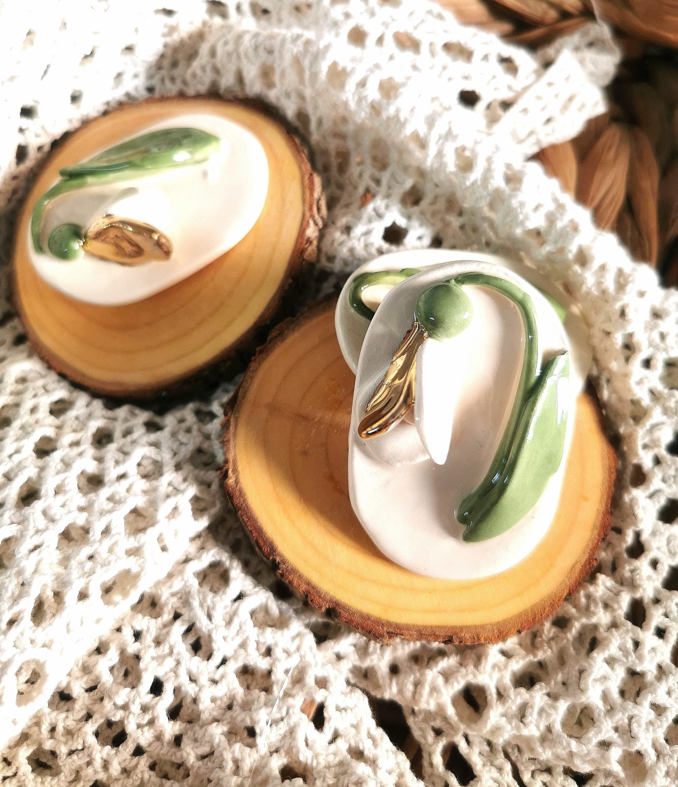 Martisorul, simbolul primaverii se regaseste in oferta noastra in diverse forme si culori. Produs lucrat manual din ceramica si ars la temperatura inalta. Pictura este realizata cu ajutorul pigmentilor peste care s-a fixat un strat finut de glazura. Fiecare produs are ac de brosa. Decoratiunea este realizata cu aur coloidal.