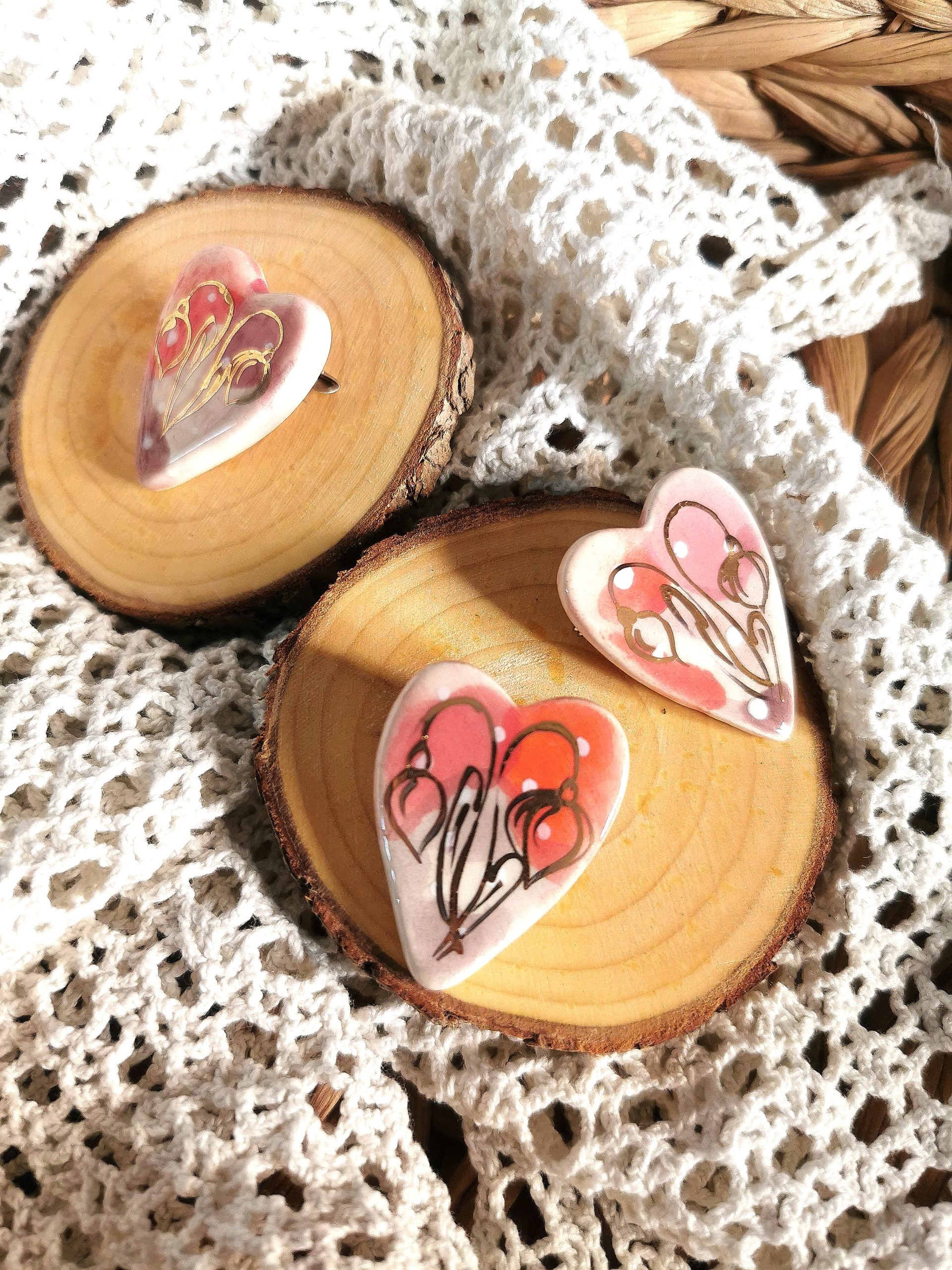 Martisorul, simbolul primaverii se regaseste in oferta noastra in diverse forme si culori. Produs lucrat manual din ceramica si ars la temperatura inalta. Pictura este realizata cu ajutorul pigmentilor peste care s-a fixat un strat finut de glazura. Fiecare produs are ac de brosa. Decoratiunea este realizata cu aur coloidal.